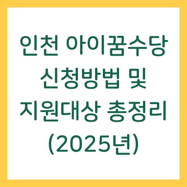 아이 낳고 키우기 힘든 요즘 세상! 2025년, 8세 자녀를 둔 인천 시민이라면 꼭 알아야 할 꿀팁! 바로 '인천 아이꿈수당'입니다. 매월 5만 원씩, 우리 아이 꿈을 위한 투자, 지금 바로 시작하세요! 인천 아이꿈수당, 신청 방법부터 지원 대상까지 핵심 정보만 쏙쏙 뽑아 정리했습니다. 놓치면 후회할지도 몰라요~!