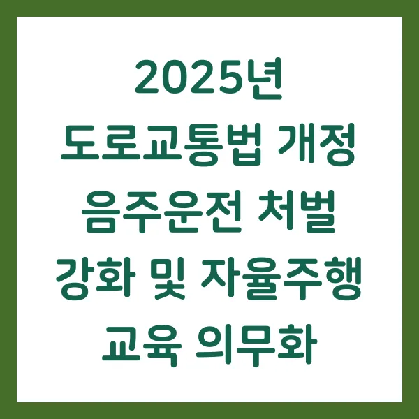 2025년, 대한민국 도로교통법이 대대적인 변화를 맞이했습니다! 음주운전 근절을 위한 처벌 강화 , 자율주행 시대 안전 운행 확보를 위한 교육 의무화 , 고령 운전자 면허 관리 강화 등 굵직한 변화들을 통해 교통 안전을 확보하고자 합니다. 개정된 도로교통법의 주요 내용과 그 의미를 자세히 살펴보고, 안전한 교통 문화를 만들어가는 데 동참해 보시는 건 어떠세요?