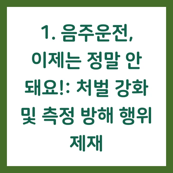 술 타기, 추가 음주, 의약품 사용 등 음주 측정을 방해하는 모든 행위 는 이제 음주운전과 동일한 수준으로 처벌 됩니다. 징역 1년~5년 또는 벌금 500만 원~2,000만 원에 처해지고, 운전면허는 당연히 취소됩니다. 음주 측정 거부와 똑같은 처벌이라니, 정말 무시무시하죠? 이를 통해 음주운전 적발을 회피하려는 시도를 원천 차단 하고 음주운전에 대한 경각심을 확실히 심어줄 것 으로 기대됩니다.