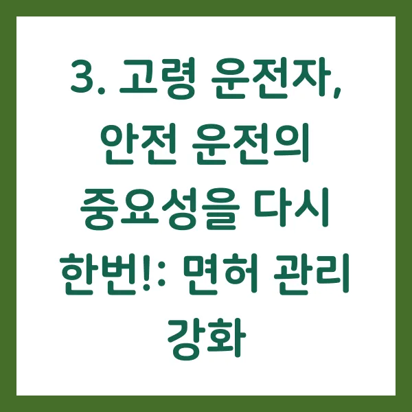 고령화 사회에서 고령 운전자의 교통사고는 심각한 사회 문제 로 떠오르고 있습니다. 이에 따라 고령 운전자의 안전 운전 능력을 정기적으로 점검하고, 필요한 교육과 지원을 제공하기 위해 면허 관리가 강화되었습니다.
