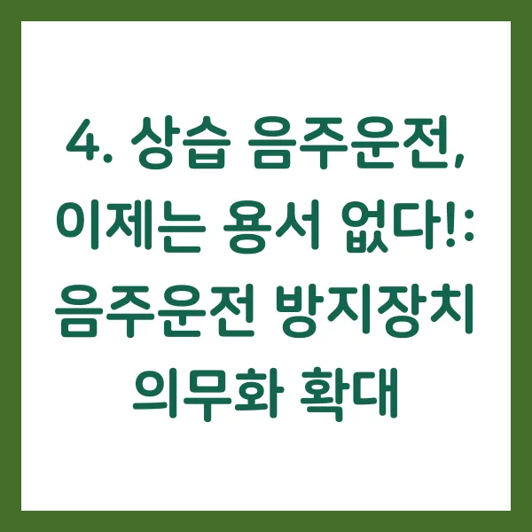 음주운전 재범 방지를 위한 노력은 멈추지 않습니다. 이번 개정에서는 음주운전 방지장치 부착 의무 대상을 확대 하여, 상습 음주운전자에 대한 제재를 더욱 강화했습니다.