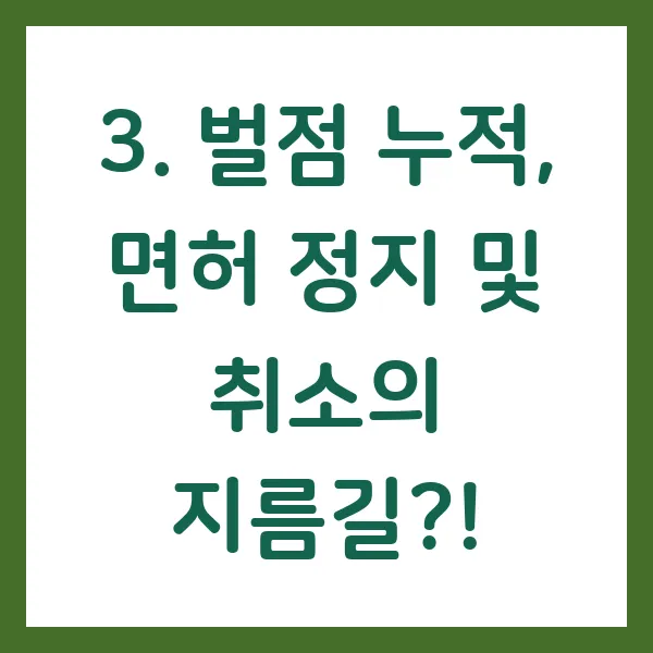 벌점은 교통법규 위반에 대한 경고 시스템으로, 누적 벌점이 일정 수준을 넘으면 면허 정지 또는 취소 처분을 받게 됩니다. 면허 정지 및 취소 기준, 꼼꼼히 확인하고 벌점 관리에 신경 쓰세요!
