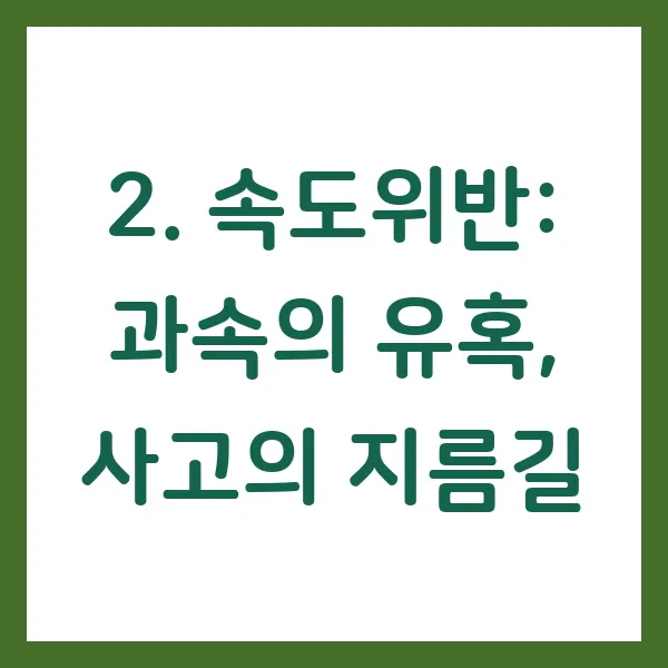 속도위반은 제동거리를 늘리고 사고 발생 가능성을 높이는 아찔한 행위입니다. 특히 고속 주행은 운전자의 시야를 좁히고 반응 속도를 떨어뜨려 위험 상황에 대한 대처 능력을 크게 저하시킵니다. '나 하나쯤이야'라는 생각은 버리고, 안전 속도 준수를 생활화합시다!