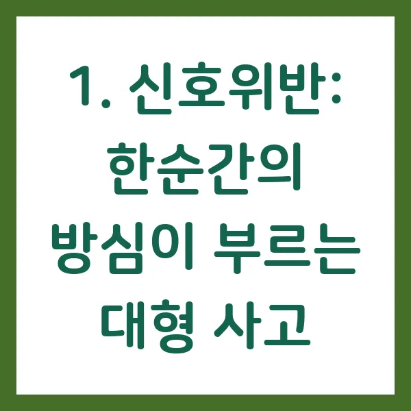 교통 신호는 도로 위의 모든 운전자와 보행자의 안전을 보장하는 약속과 같습니다. 이 약속을 어기는 신호위반은 교통 흐름을 방해할 뿐만 아니라, 예측 불가능한 사고를 유발하는 주요 원인이 됩니다. 한순간의 방심으로 돌이킬 수 없는 결과를 초래할 수 있다는 사실, 잊지 마세요!