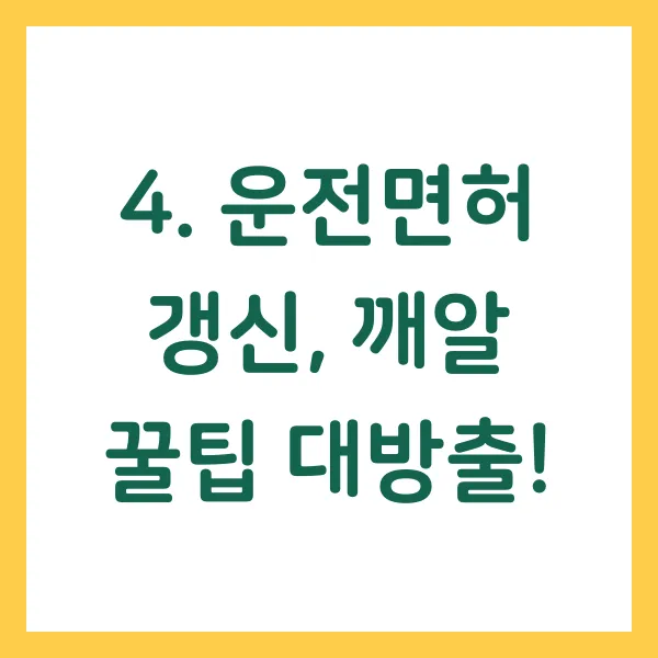 갱신 기간 놓치지 않으려면? 도로교통공단과 정부24에서 갱신 알림 서비스를 신청하세요! 과태료 연체 걱정도 끝! 정부24나 은행 앱에서 자동이체 설정하면 편리합니다. 해외 체류 중 면허가 만료되었다면? 귀국 후 1개월 이내에 갱신하면 과태료 면제! 해외 체류 증빙서류 꼭 챙기세요!