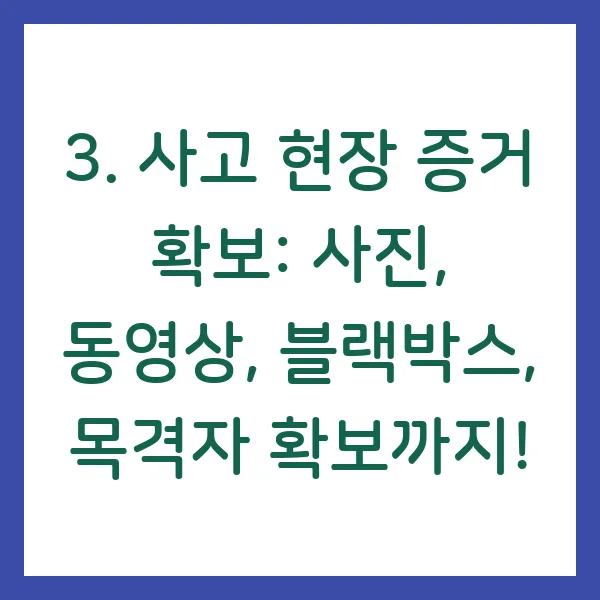 사고 당시 상황 기록은 과실 비율 산정 및 보험 처리의 핵심! 사진과 동영상 촬영은 필수 중의 필수입니다. 어떤 것들을 찍어야 할까요? 전체적인 사고 현장, 차량 손상 부위, 타이어 마찰 흔적(스키드 마크)까지 꼼꼼하게 기록해야 합니다. 블랙박스 영상 확보는 두말할 필요도 없겠죠? 메모리 카드는 안전하게 분리 보관! 목격자가 있다면 연락처 확보는 필수 입니다. 증거 확보, 철저하게 할수록 유리합니다!