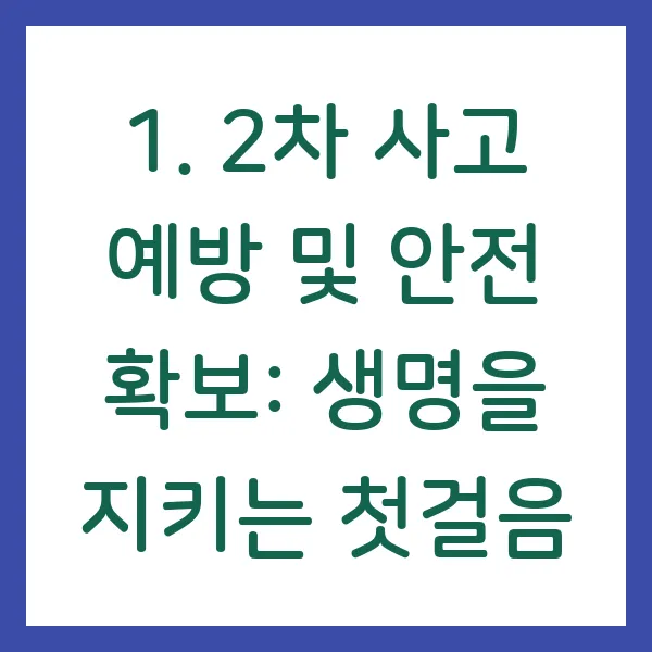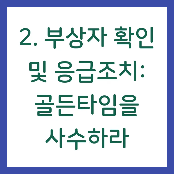 2차 사고 예방 후, 부상자 확인은 필수 입니다. 부상자가 있다면 119 신고는 즉시! 구급대원 도착 전까지 응급처치는 생명을 구하는 중요한 열쇠입니다. 환자 상태 악화는 절대 금물! 경추 손상 의심 시에는 함부로 움직이면 안 됩니다. 출혈 발생 시? 깨끗한 거즈나 천으로 압박 지혈! 심정지 상태라면 심폐소생술을 시행해야 합니다. 응급처치는 골든타임 확보의 핵심 이라는 것, 잊지 마세요!