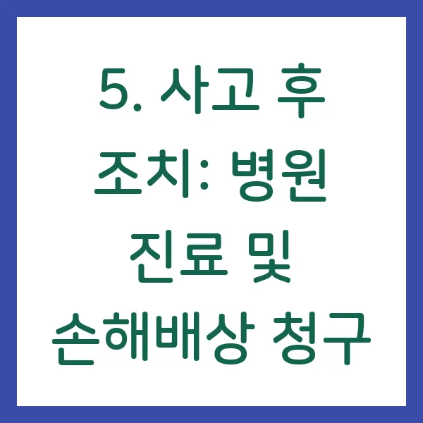 사고 후유증, 절대 방심 금물! 사고 직후 병원 진료는 필수 입니다. 진단 결과를 바탕으로 가해자 측 보험사에 치료비, 휴업 손해, 위자료 등 손해배상 청구! 합의가 잘 안 된다면? 금융감독원 분쟁조정위원회나 법원의 문을 두드려 보세요.