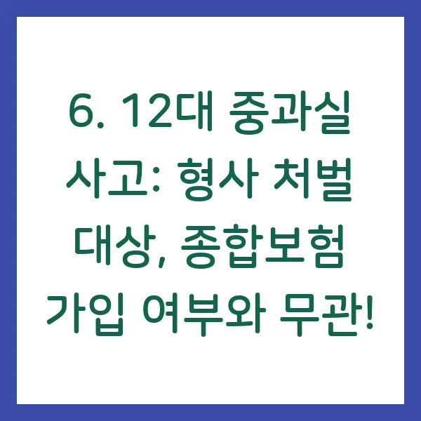 12대 중과실 사고는 신호 위반, 중앙선 침범, 제한 속도 위반, 앞지르기 방법 위반, 철길 건널목 통과 방법 위반, 횡단보도 사고, 무면허 운전, 음주운전, 보도 침범, 승객 추락 방지 의무 위반, 어린이 보호구역 안전운전 의무 위반, 화물 고정 조치 위반 등이 포함됩니다. 이러한 사고를 일으킨 경우, 종합보험 가입 여부와 상관없이 형사 처벌 대상 이라는 사실! 피해자와 합의해도 처벌을 피할 수 없다는 점, 명심하세요.