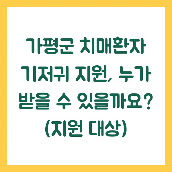 가평군에 거주하는 재가 치매 환자 중 치매안심센터에 등록된 분 이라면 신청 가능합니다! '재가'라는 건 요양시설이나 병원에 입원하지 않고 집에서 생활하는 걸 말해요. 시설이나 병원에 계신 분들은 아쉽지만 지원 대상이 아니랍니다. 치매안심센터 등록은 필수 니까, 아직 등록 안 하셨다면 서둘러 가까운 센터에 방문하세요! 치매 진단을 받지 않았더라도 치매가 의심되는 경우, 상담 및 검진을 통해 지원 대상 여부를 확인할 수 있으니 걱정 마세요.