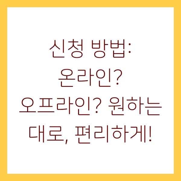 '신청 절차가 복잡할까봐 걱정이라고요?' 천만의 말씀! 클릭 몇 번 또는 방문 한 번으로 간편하게 신청하세요! 상시 신청이 가능하다는 점도 놓칠 수 없는 장점입니다.
