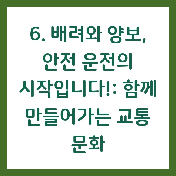 나부터 안전 운전을 실천하고 다른 운전자를 배려하는 작은 행동 하나하나가 모여 안전한 교통 문화를 만들어갑니다. 서로 존중하고 배려하는 마음으로 운전한다면, 교통사고 없는 안전한 사회를 만들 수 있을 것입니다.