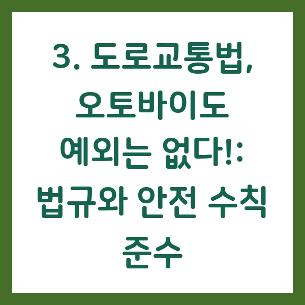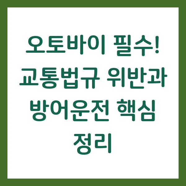 오토바이 운전자에게 교통 법규 준수와 방어 운전은 필수입니다! 도로 위의 예측 불가능한 상황과 교통사고 위험으로부터 자신을 보호하기 위한 핵심 정보들을 여기에서 확인하세요. 안전장비 착용부터 법규 해석, 방어운전 기술, 사고 대처 요령, 그리고 미래 교통안전 전망까지, 오토바이 라이더라면 반드시 알아야 할 모든 것을 담았습니다. 지금 바로 안전 운전의 첫걸음을 시작하세요!