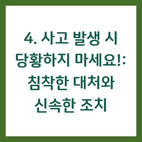 사고 발생 후 초기 대응은 매우 중요합니다. 골든타임을 놓치지 않고 신속하게 대처해야 피해를 최소화할 수 있습니다. 특히 부상자가 있다면, 119 구급대가 도착할 때까지 응급 처치를 시행하는 것이 중요합니다. 응급 처치 요령을 미리 숙지 해두면 위급 상황에서 큰 도움이 될 수 있습니다.