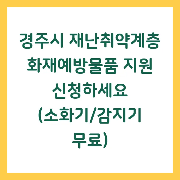 화재는 언제 어디서 발생할지 모르는 무서운 재난입니다. 초기 진압이 중요한데, 스스로 대처하기 어려운 분들도 계시죠. 경주시는 이러한 재난취약계층의 안전을 위해 화재예방물품 지원 사업을 시행하고 있습니다. 소화기와 감지기, 작지만 강력한 안전 지킴이들을 무료로 지원해 드립니다! 이 사업을 통해 화재로 인한 피해를 최소화하고, 시민 모두가 안전한 경주를 만들어가고자 합니다.