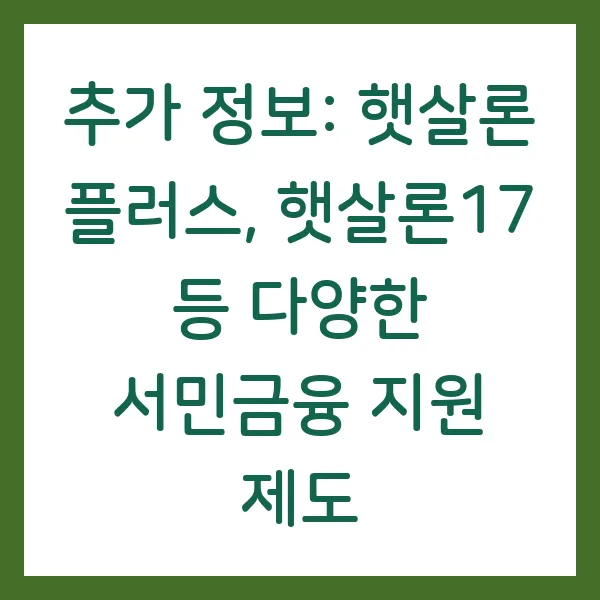 햇살론 외에도 다양한 서민금융 지원 제도가 있습니다. 햇살론 플러스는 햇살론 이용 후 성실하게 상환한 경우 추가 대출을 지원하는 제도이며, 햇살론17은 저소득·저신용 근로자를 위한 더욱 특화된 지원 제도입니다. 자신에게 맞는 제도를 꼼꼼하게 비교하고 선택하는 것이 중요합니다. 서민금융진흥원 홈페이지를 방문하여 더 자세한 정보를 확인해 보세요.