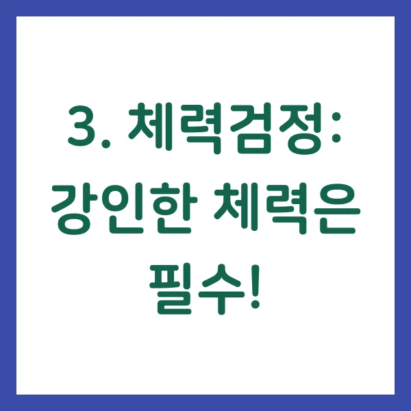 부사관은 강인한 체력이 필수입니다. 팔굽혀펴기, 윗몸일으키기, 3km 달리기 세 종목을 평가하며, 각 종목별 1점에서 10점까지 점수를 부여합니다. 총점은 30점 만점입니다.