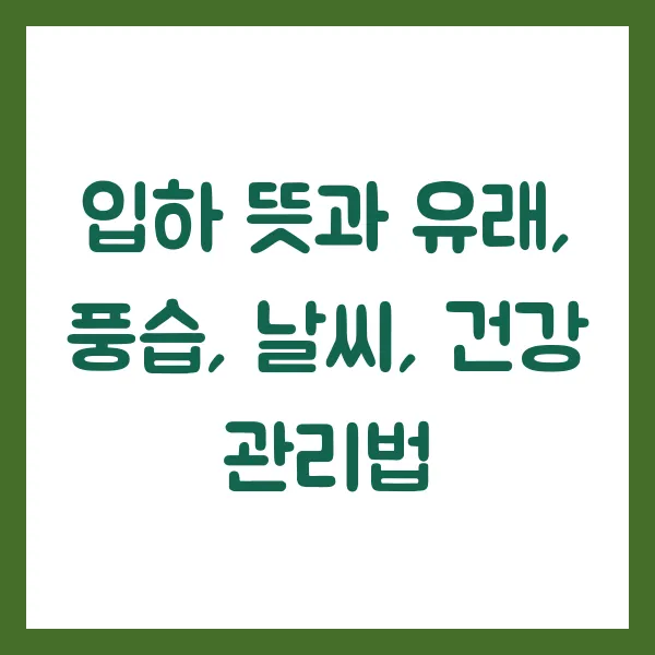 | 입동 뜻 유래 풍습 날씨 변화 건강 관리 (0) | 2025.05.30 |