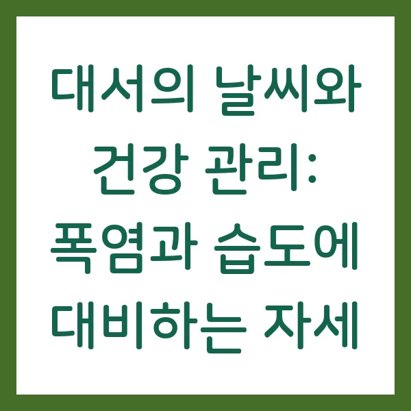 대서에는 낮 최고기온이 35도를 웃도는 폭염이 기승을 부립니다. 밤에도 기온이 25도 아래로 내려가지 않는 열대야 현상이 나타나기도 합니다. 높은 기온과 습도로 인해 온열질환 발생 위험이 높아지는 시기이므로 건강 관리에 각별히 유의해야 합니다.