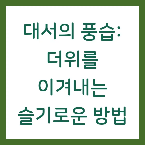 대서 무렵은 햇볕이 워낙 강렬해서 곡식을 말리기에 최적의 시기였습니다. 보리, 밀과 같은 곡식을 햇볕에 말려 잘 보관하고, 나물을 말려 겨울철 식량을 준비하기도 했습니다. 자연의 흐름을 이해하고 이를 활용하는 우리 조상들의 지혜가 돋보이는 풍습입니다.