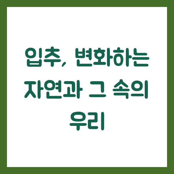 입추는 단순히 더위가 물러가고 가을이 시작되는 시점이 아닙니다. 자연의 순환 속에서 우리 삶의 지혜를 배우고, 새로운 계절을 준비하는 중요한 시기입니다. 입추의 의미를 되새기며, 변화하는 자연에 순응하고 다가올 계절을 슬기롭게 맞이하는 지혜를 발휘해 보는 것은 어떨까요?