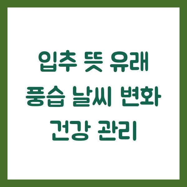 입추는 여름과 가을이 교차하는 환절기입니다. 큰 일교차로 인해 면역력이 저하되기 쉬우므로 건강 관리에 각별히 신경 써야 합니다. 충분한 수면과 규칙적인 운동으로 체력을 관리하고, 균형 잡힌 식사를 통해 영양을 보충하는 것이 좋습니다. 특히, 제철 과일과 채소를 충분히 섭취하여 비타민과 무기질을 보충하는 것이 면역력 강화에 도움이 됩니다. 또한, 외출 시에는 얇은 겉옷을 준비하여 급격한 온도 변화에 대비하는 것이 좋습니다. 개인 위생에도 신경 써서 손을 자주 씻고, 마스크 착용 등 감염병 예방 수칙을 준수하는 것도 중요합니다.