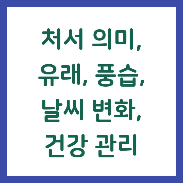 처서는 여름의 끝자락과 가을의 시작을 알리는 절기입니다. 자연의 변화에 귀 기울이고, 건강 관리에 유의하여 새로운 계절을 맞이할 준비를 해야겠습니다. 옛 조상들의 지혜가 담긴 전통 풍습을 되새기며, 환절기 건강을 지키고 풍요로운 가을을 맞이하시길 바랍니다.