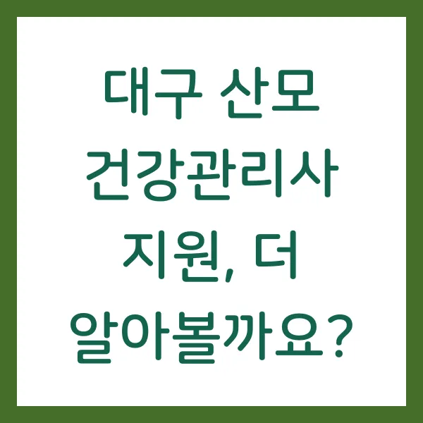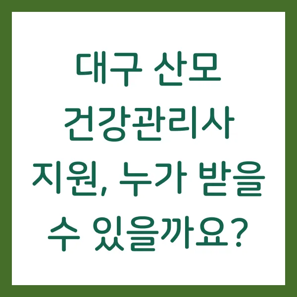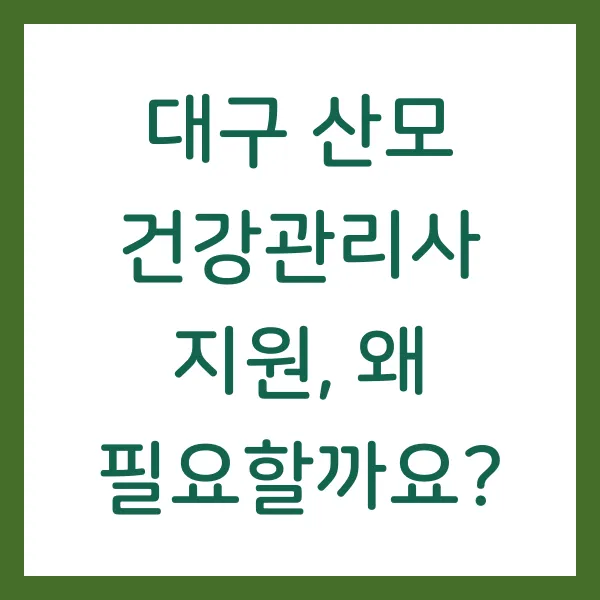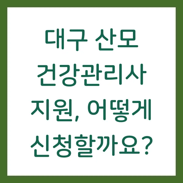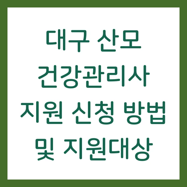 대구시의 산모 건강관리사 지원 사업은 출산 가정의 경제적 부담을 완화하고 산모의 건강한 회복을 돕는 중요한 정책입니다. 지원 대상과 신청 방법을 꼼꼼히 확인하여 혜택을 놓치지 말고, 건강하고 행복한 산후조리 기간을 보내시길 바랍니다.
