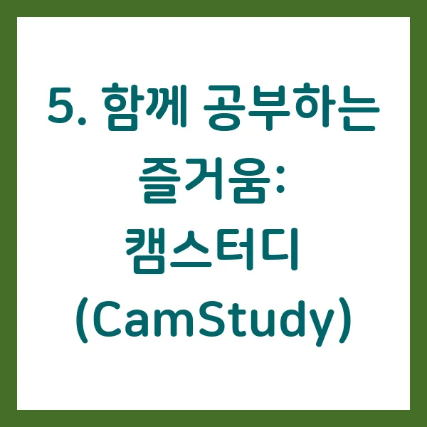장점: 다른 학습자들과 함께 공부하며 동기 부여 가능, 스터디 관리 기능 제공, 실시간 소통 기능으로 스터디 그룹 운영에 필요한 모든 기능을 제공합니다. 단점: 인터넷 연결 필수, 다수 접속 시 서버 불안정 발생 가능성이 있습니다. 사용자 후기: "캠스터디 덕분에 스터디 그룹원들과 꾸준히 공부하고 있어요! 서로 격려하고 도와주면서 학습 효율이 높아졌어요." - 취업 준비생 정OO 가격: 무료