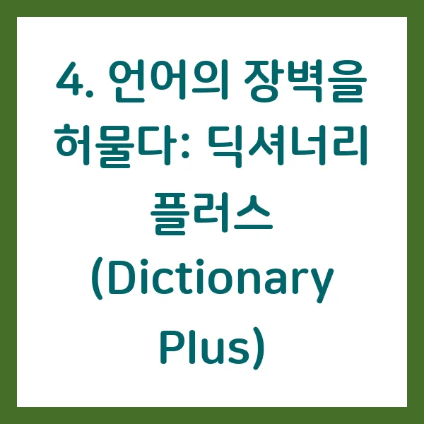 장점: 풍부한 어휘 및 예문, 빠른 번역 속도, 오프라인 사용 가능으로 인터넷 연결 없이도 언제 어디서든 사용할 수 있습니다. 단점: 유료 구독 시 광고 제거 (월 4,900원), 일부 언어는 번역 정확도가 떨어질 수 있습니다. 사용자 후기: "딕셔너리 플러스는 외국어 공부 필수템이에요! 언제 어디서든 모르는 단어를 바로 찾아볼 수 있어서 편리해요." - 중학생 최OO 가격: 무료 (광고 포함), 프리미엄 구독 (월 4,900원)