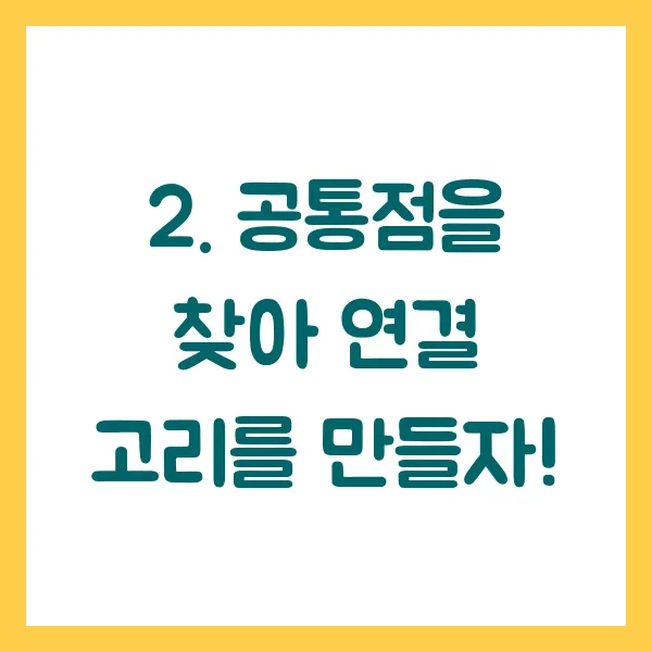 나와 비슷한 점이 많은 친구를 찾는 것은 친구 사귀기의 지름길! 같은 반 친구들의 이야기에 귀 기울여 보세요. 좋아하는 아이돌, 즐겨보는 영화, 취미 생활, 좋아하는 음식, 싫어하는 과목 등 공통 관심사를 발견하면 대화를 시작하기도 쉽고, 금세 친해질 수 있답니다. 수업 시간에 발표를 잘하는 친구에게 "발표 정말 잘하던데, 혹시 스피치 학원 다녀?" 와 같이 질문을 던져 공통 관심사를 찾아보는 것도 좋은 방법입니다. 점심시간이나 쉬는 시간에 친구들이 무슨 이야기를 하는지 잘 들어보고, 자신과 비슷한 관심사를 가진 친구가 있다면 먼저 다가가 대화를 시도해 보세요.