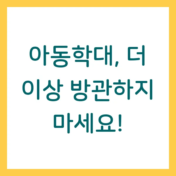 아동학대는 범죄입니다. 아이들의 미래를 위해, 우리 사회의 건강한 발전을 위해, 아동학대 근절에 적극적으로 동참해 주세요! 주변에 도움이 필요한 아이가 있다면, 주저하지 말고 손을 내밀어 주세요. 당신의 작은 관심과 용기가 아이의 삶을 바꿀 수 있습니다. 함께, 아이들의 밝은 미래를 만들어 갑시다!