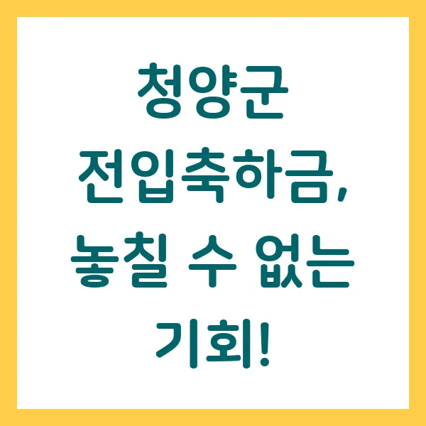 청양군 전입축하금에 대한 모든 궁금증이 해결되셨나요? 청양군은 여러분의 새로운 시작을 응원하며, 더욱 풍요롭고 행복한 삶을 위해 최선을 다해 지원할 것을 약속드립니다. 자세한 내용은 청양군청 홈페이지( https://www.cheongyang.go.kr ) 또는 관할 주민센터를 통해 확인하세요! 청양에서 만나요!