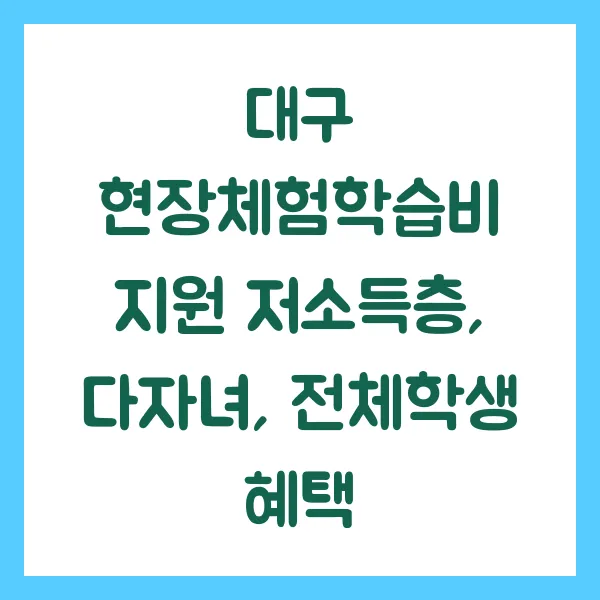 대구광역시 교육청은 저소득층, 다자녀 가정, 그리고 모든 학생들의 현장체험학습 참여 기회 확대 를 위해 현장체험학습비를 지원 합니다. 지원 대상, 지원 금액, 신청 방법, 문의처 등 2025년 최신 정보를 지금 바로 확인하세요! 더 넓은 세상을 경험하고 꿈을 키워나갈 기회, 놓치지 마세요! #대구교육 #현장체험학습 #교육복지 #저소득층지원 #다자녀지원