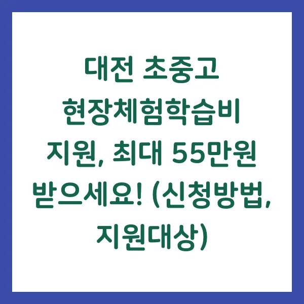 대전시 초·중·고 학생 여러분 주목! 꿈을 향한 발걸음을 내딛을 기회, 현장체험학습비 지원 사업을 소개합니다. 최대 55만 원까지 지원되는 이 혜택, 지금 바로 신청하세요! 저소득층, 다자녀 가정 등 지원 대상과 신청 방법, 지원 내용까지 꼼꼼하게 알려드립니다. 더 넓은 세상으로, 꿈을 향해 나아가세요! #현장체험학습 #대전교육청 #교육복지 #수학여행비지원 #다자녀지원