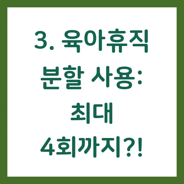 아이의 어린이집, 유치원, 초등학교 입학 시기 등을 고려하여 전략적으로 분할 사용 계획을 세우는 것이 좋습니다 . 육아와 직장 생활을 조화롭게 병행할 수 있도록 돕는 제도인 만큼, 나에게 맞는 최적의 활용법을 찾아보세요!