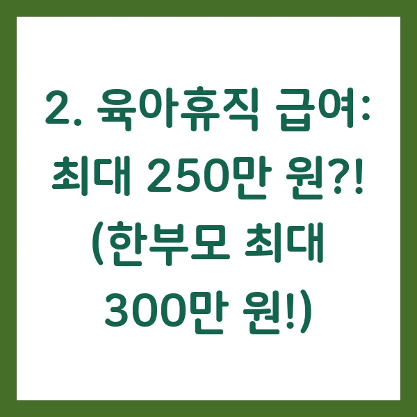 가장 큰 변화는 바로 지급 방식 입니다. 기존에는 급여의 25%를 복직 후에 지급했지만, 이제는 육아휴직 기간 동안 전액을 지급 받게 됩니다. 현실적인 경제적 어려움을 해소하고 육아에 전념할 수 있도록 지원하는 정부의 배려가 돋보이는 부분입니다. 게다가 부부가 동시에 육아휴직을 사용하더라도 월 최대 250만 원까지 지원 받을 수 있다는 사실! 부부가 함께 아이를 키울 수 있는 환경을 조성하기 위한 노력이 엿보입니다.